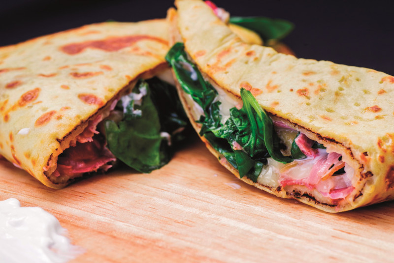 Cum se cheamă prăvălia, așa se cheamă și preparatul care mi-a mers la inimă: Brutal Russian. În aluatul clasic rusesc de clătite, se pun fâșii de mușchi de vită cu condimente, fâșii de ardei copţi, muștar cu boabe, măsline verzi fără sâmburi, baby spinach și smântână. Combinaţia vă poate părea fistichie, dar face toţi banii și, sigur că depinde în bună măsură de apetitul fiecăruia, se cere repetată imediat, fiindcă mai bună decât o clătită rusească, vă rog să mă credeţi pe cuvânt dacă n-aţi ajuns încă la Gleb, nu-s decât două clătite rusești.
