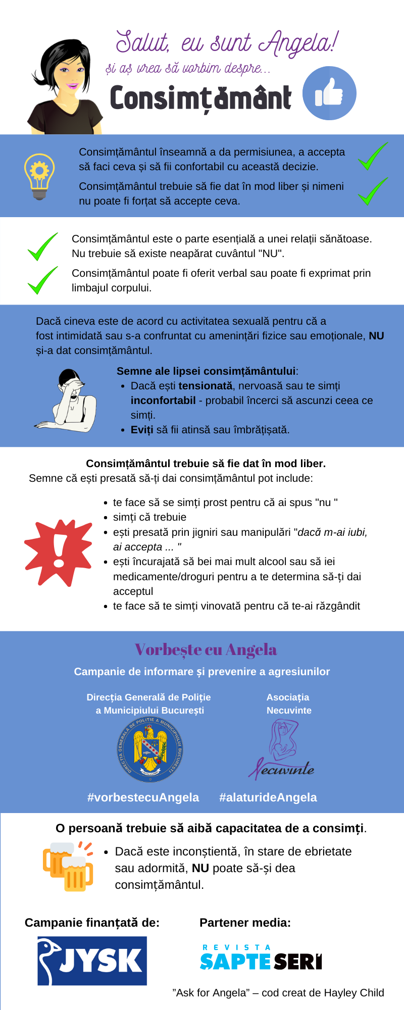 Violența împotriva femeilor este un fenomen universal, de aceea este important să cunoaștem și să susținem activ campaniile dezvoltate în acest sens, așa cum este Vorbește cu Angela, o campanie de prevenire a agresiunilor sexuale realizată de Direcția Generală de Poliție a Municipiului București, în parteneriat cu Asociația Necuvinte.